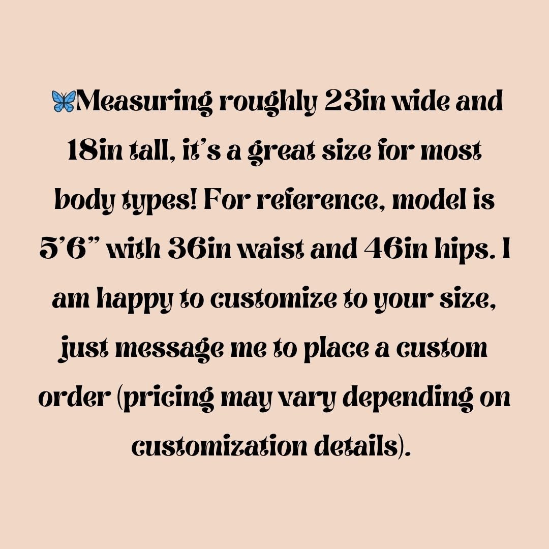 🦋Measuring roughly 23in wide and 18in tall, it’s a great size for most body types! For reference, model is 5’6” with 36in waist and 46in hips. I am happy to customize to your size, just message me to place a custom order (pricing may vary depending on customization details).
