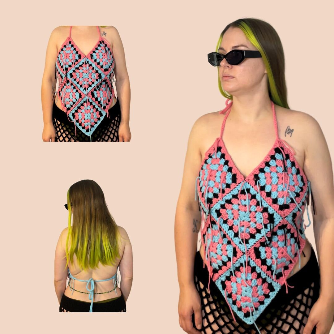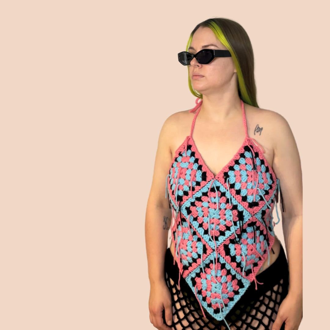 🦋The Caroline Halter Top has an open back and is secured with two crochet ties. An adorable summer top that is perfect for any occasion and a great addition to any closet. Pairs great with our Levi’s Denim Shorts. Granny Square Crochet Handmade Halter Top.