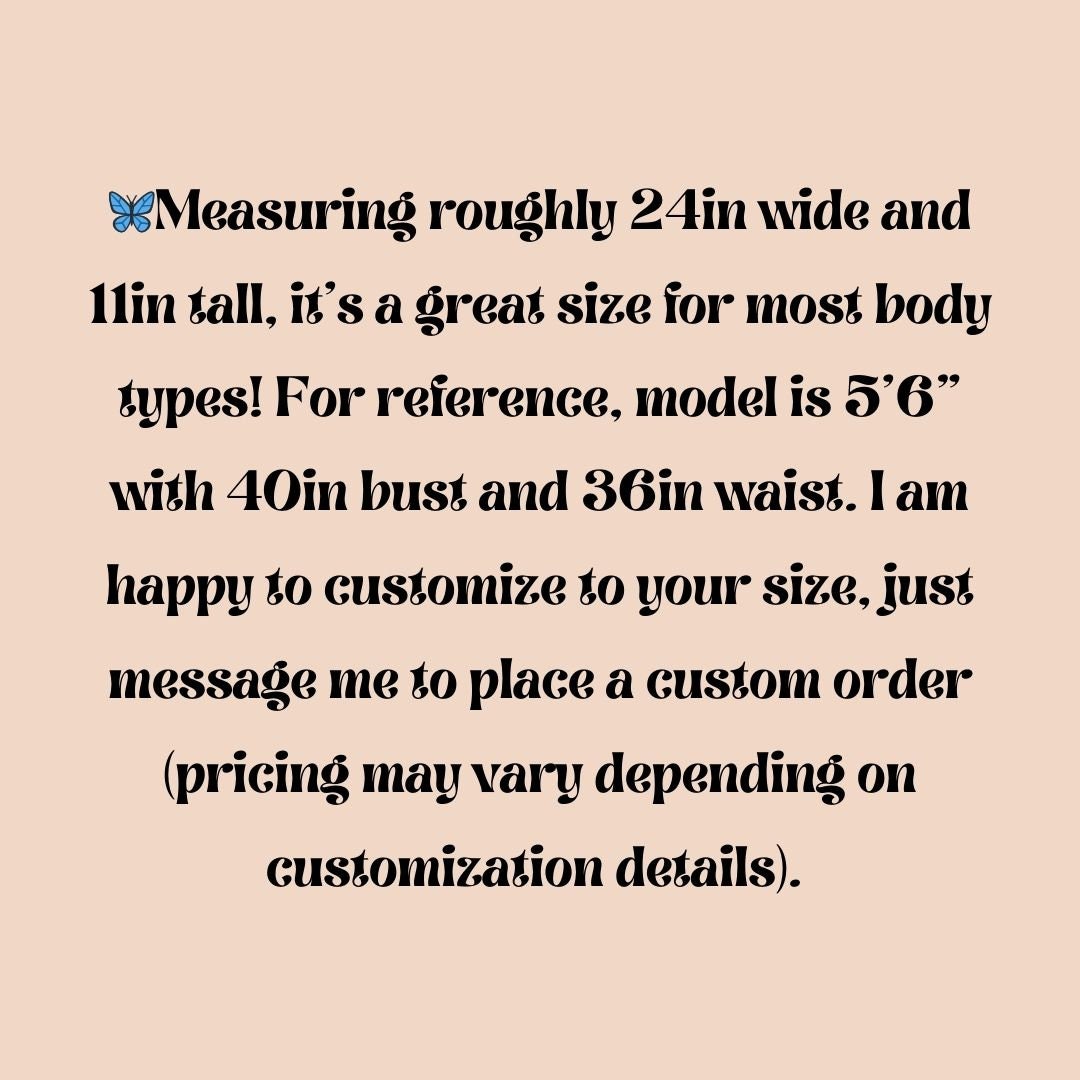 🦋Measuring roughly 24in wide and 11in tall, it’s a great size for most body types! For reference, model is 5’6” with 40in bust and 36in waist.